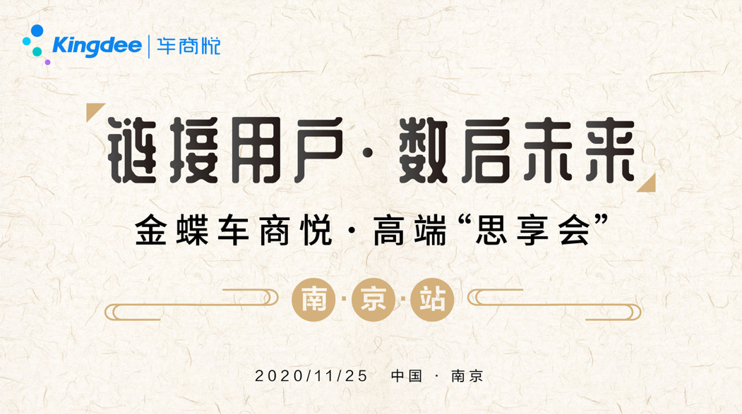 11月25日14:00,金蝶車商悅高端“思享會”在南京頤和芥子園酒店舉行,本次大會以“鏈接用戶,數啟未來”為主題,與南京地區的多家汽車經銷商集團,一同探討疫情和經濟雙重壓力的新局勢下,汽車企業的數字化經營之道!